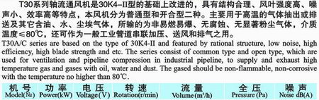 T30C型玻璃鋼外接式軸流通風(fēng)機(jī)具有結(jié)構(gòu)合理、設(shè)計(jì)簡(jiǎn)單、靜壓及效率高、防腐性能良好、噪音低、運(yùn)轉(zhuǎn)平穩(wěn)、機(jī)械振動(dòng)小、氣流順暢等特點(diǎn)。該系列風(fēng)機(jī)電機(jī)裝配在風(fēng)機(jī)筒體上部,有可調(diào)的電機(jī)支承座板,采用角帶傳動(dòng),從而使風(fēng)機(jī)所輸送的各種耐腐性氣體與電機(jī)隔離,保證電機(jī)使用壽命。風(fēng)筒內(nèi)采用外溝球面萬(wàn)向軸承座,具有體積小、密封性能好等到優(yōu)點(diǎn)。該系列風(fēng)機(jī)主要適用于一般工業(yè)管道串聯(lián)加壓、送風(fēng)及排氣使用。所輸送氣體不允許含有粘性物質(zhì)、所含粉塵及硬質(zhì)顆粒≤150mg/m3、氣體溫度≤60℃、相對(duì)濕度≤100%。